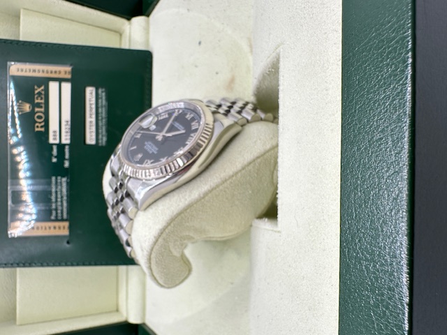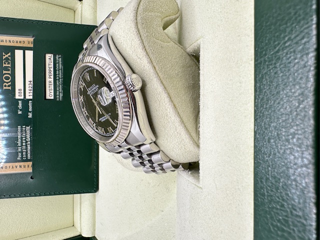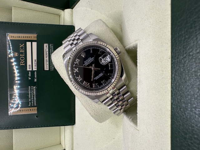 We offer for sale a Rolex Datejust Reference 116234 year 2008 in very good condition. Iconic Rolex watch, excellent for all occasions, with a beautiful Black Roman numbers dial and with white gold bezel , which makes it captivating and elegant at the same time. It is sold complete with the original box (NO OUTER BOX), Rolex Guarantee plus our 12-month guarantee.