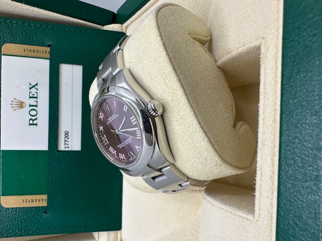 We offer for sale a Rolex Oyster Perpetual 31MM Reference 177200, 2018, with an extremely rare 'Red Grape Roman Numeral' dial in exceptional condition. This watch is the perfect choice for women, perfectly combining elegance and sportiness, adding a touch of vivacity to any time of day with its vibrant color. It comes complete with its box (NO OUTER BOX), Rolex warranty, and our 12-month warranty.